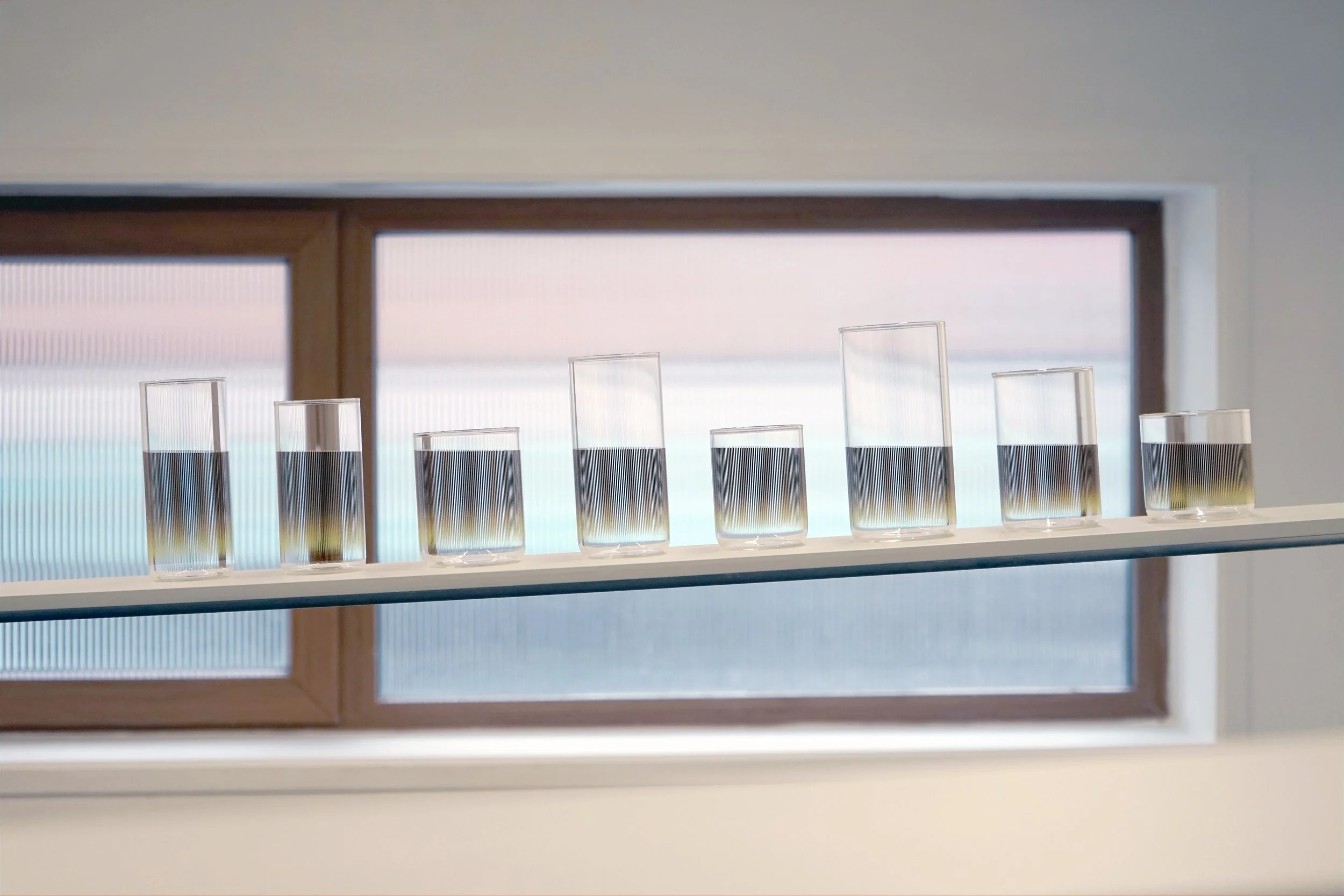 이 감각은 물리적 세계의 파동으로 확장됩니다. 〈Liquid Glass〉는 유리잔의 세로선들이 중첩되며 만들어내는 물리적 무아레를 통해 실재의 이면을 드러냅니다. 닿을 수 없는 거리에서 관찰되는 이 일렁임은, 우리가 마주하는 풍경이 견고하고 꽉 찬 매스(mass)가 아니라 무수한 원자들이 발산하는 파동이 부단히 서로를 간섭하며 빚어낸 거대한 이미지이자 환영임을 환기시킵니다. 텅 빈 원자들로 이루어진 이 세계는 고정된 실체가 아니라, 순간순간 중첩되어 만들어진 결과물의 한 단면일 뿐입니다.